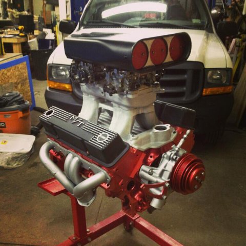 Ill try and keep this updated as parts arrive. Currently waiting on the rotating assembly, scat 1-40900-Bi 4340 3.875 stroke 6" H-beam rods and forged pistons 11.4:1 compression Heads are world products sportsman II built to hell with a complete lunati valvetrain max lift is .660 Hedman headers Msd 8691? I think pro billet dizzy Edelbrock tunnelram with dual 1403 carbs and enderle scoop (Carbs will probably be swapped for holley 450s) Cam is .241/.249 @.50 and .525 /.541 lift 110lsa 106lcl Block is arp studded through out Block Is a 4bolt main 010 high nickle content Pic is of mockup, tracing out gaskets and removing paint for good sealing