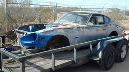 Y'all are familiar with the Green Machine, but today I acquired another Z (#4 for me). This is HLS30-06367 (June 1970). Donated by my good friend Jon "Speedgato" from Desert Datsuns Arizona way. My Green Machine was born green and will always be that way. This car was born Blue and will always be the Blue car. Corsair blue... And will become another dedicated track car. It will undergo a full race-car transformation and drive again as it once did. Thank you Jon, and thanks to the Desert Datsuns gang for all their help over the years. And "Special" thanks to Chris Dowers who devotes so much time to my projects. You really are a "Special Person". Now, what you've all been waiting for... Remarkably little rust. Some damage up front and possible impact damage in the back. All will be easily fixed. Only Z I've ever come across with NO / ZERO / NONE modifications to it. Bone stock. lol: