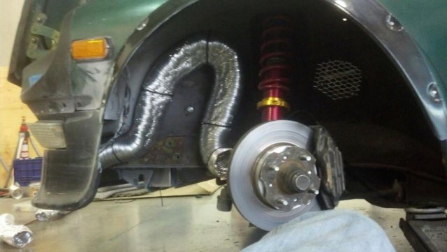 I bought dinky 3" alum flange things from Aircraft Spruce and 3" Toaster Oven duct from Lowes. It doest rub at full lock static. Who knows what will happen after I launch off a burm sideways this weekend. I squirted directly at the vented rotor center. -