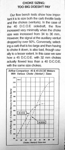 Found this graph from an unknown source on an Alfa BB. If this chart is accurate it suggests diminishing returns past about 34mm chokes on DCOE40 and is certainly plausible. -