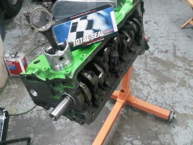Crank is in and toqued, vent grate and baffle in, rear cap sealed (f'er better not leak, those stupid side seals suck). Started to load the rings and realized my ring compressor was no good. You gotta have the correct Total Seal compressor to get the rings in right. With the TS compressor you can watch the rings load into the compressor and then better install into the bore. Stuck until Monday.