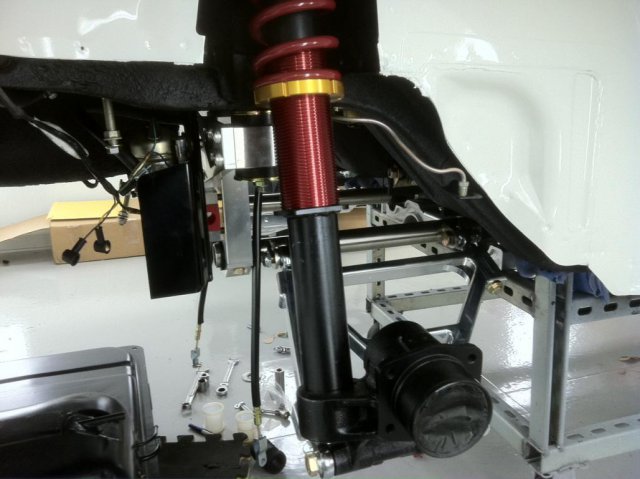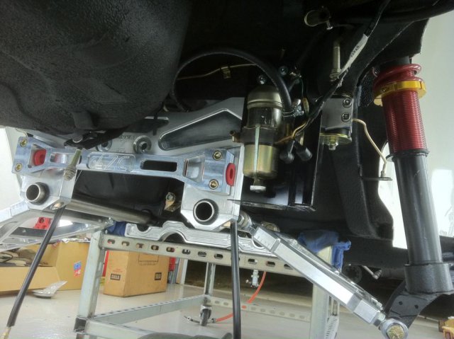 Rears today with Arizona Z car rear end, coilovers and Tokico Illuminas. Refurbished 280z stub axles with 280zx turbo companion flange adapters. New bearings, seals, rotors, calipers and plated hardware.