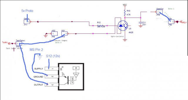 Pin 2 of the sensor is grounded to pin 2 on the megasquirt box. The output pin (pin 3 on the sensor) is connected to XG1. Megasquirt would not read the 6-1 pattern correctly if it was wired up as per your diagram. Megasquirt needs the opto-isolator to light when there is a magnet in front of the sensor, and be off otherwise. The sensor grounds pin 3 when there is a magnet present, so in your diagram the opto-isolator would be lit except when there was a magnet there, which is backwards. To the best of my knowledge, Megasquirt will not read it that way (at least not with a 6-1 configuration). Edit: See attachment for my current mostly-working set-up.