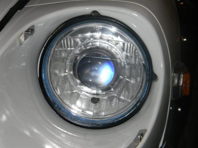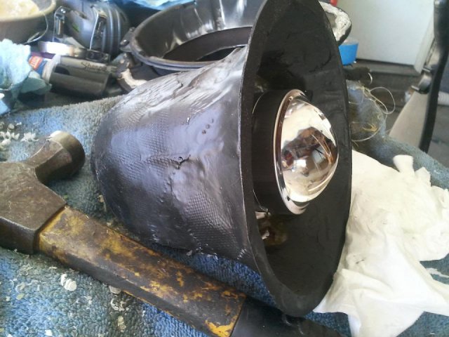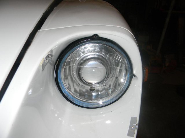 So this weekend I decided to mess with these HID lights since the ebay type 7" round headlight suck. The glare is horrible its like its always on high beams. So I decided to mess with the projectors I opened them up and right away I saw that the lens looks like the bottom of a coke bottle just bad, and it didn't have a cut out plate. I had a set of silvia 2 projectors that I had used on a 240sx I used to have, I took those apart and used the low beam projectors which have a fixed cut off plate. Made a fiberglass enclosure so no moisture gets in. Yet I'm still using the original buckets just that I had to cut the back part but still retain the spring so I can align the light.
