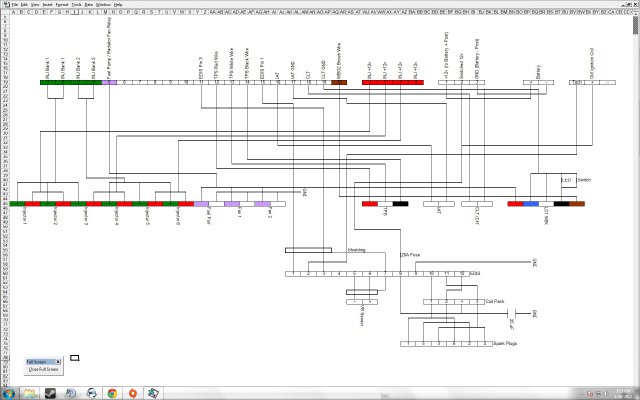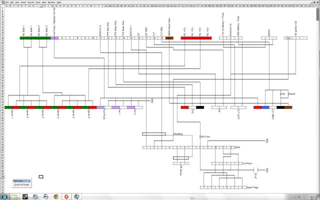 Hello readers, I've put my turbo engine in the car over the past weekend (pic attached) and I'm getting ready to wire the car, but before I start, I want to make sure my wiring diagram that I will be following is correct. I have been doing what seems like endless reading and research but the best way to make sure what I have is correct is review by the experts. If any of you can spare some time to review what I have, that would be absolutely amazing. I hate to be a nuisance. Attached is a wiring diagram made in EXCEL. The diagram shows the wiring between the relay board and the car. The 4-hole socket for injector power, and the other 3-holes for relay board/MS power were rotated 90 degrees clockwise for simplicity. I tried to be detailed regarding where the wires go. Things to note about the car: 1973 240z MS2 V3.57 board Relay board l28et stock 280cc injectors (I'll be using PWM controls for these instead of the resistor pack. As such, I will use the injector settings posted by Z-ya here: http://forums.hybridz.org/index.php/topic/55910-injector-opening-times-spread-sheet/) stock t3 turbo EDIS (using the edis-6 diagram posted on the MS website here: http://www.megamanual.com/ms2/EDIS.htm) coil pack from a 2000 Dodge caravan 3.3L (mine has the plug type with the 4 spades in a row, so im using the info posted here by cygnusx1 as a reference: http://forums.hybridz.org/showpost.php?p=930882&postcount=18) -- note on edis to ign coil pack wiring: since the L-series firing order is 153624, i wanted the edis module to fire the coils from one side to the other in order to clean up the spark plug wires. Since EDIS fires the coils attached to pins 10,11,12 on the edis module in the firing order 10->12->11->10.. etc, I needed pin 10 to connect to the coil pack for the cylinders that fire first and fourth in the Z firing order which is 1-6, then pin 12 needed to go to the next adjacent coil pack to fire cylinders 2-5, and lastly edis pin 11 to the remaining coil pack, and hence to the last 2 clyinders (3-4). Please let me know if this logic is fouled. Innovate LC-1 (using the info in the quick start guide found here: http://www.innovatemotorsports.com/support/quickstart/LC-1_Quickstart.pdf and also from DIYautotune found here: http://www.diyautotune.com/faq/faq.htm#LC1wiring) 2 elec. radiator fans also wired into the fuel pump relay. CLT sensor will use the CHTS (I'll have to calibrate it in MS using the values found here: http://forums.hybridz.org/index.php/topic/57800-280z-coolant-temp-sensor-values-for-easytherm/) Please post any comments, concerns, errors, constructive/destructive criticisms, etc. Thank you all very much for your time. James