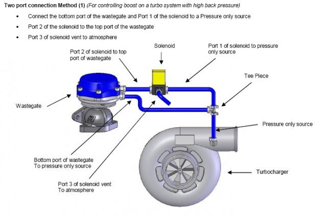 Hi, It appears the forth diagram above is correct one to use for a external waste gate. so, now I have 7PSI (waste gate default spring), with the unit off, 10 PSI on low, and 15PSi on high, I have fitted a remote on/off, and momentary switch to select between lo and high, work very nicely Nigel -