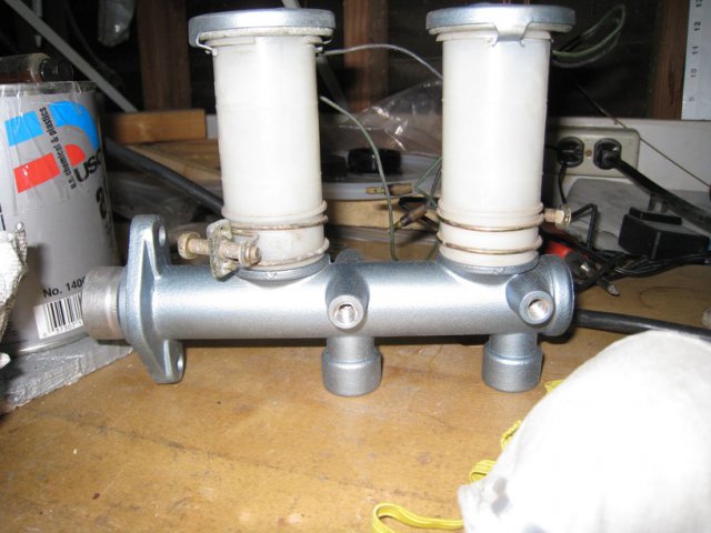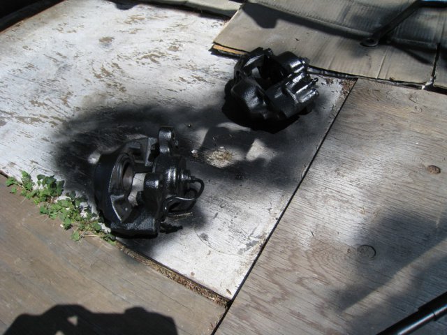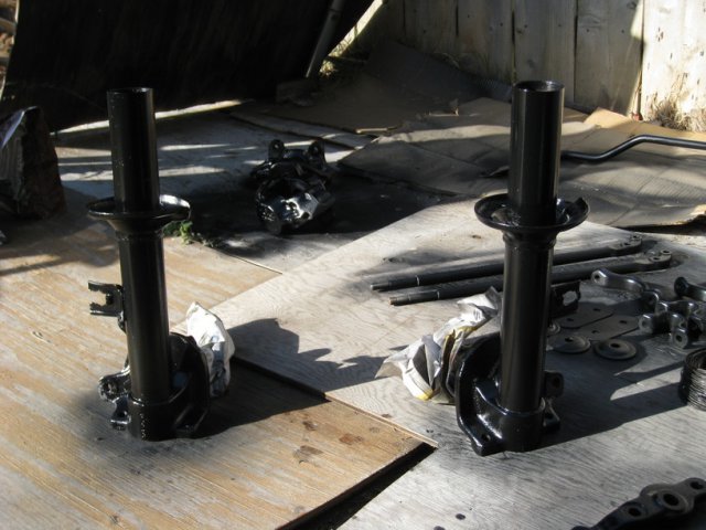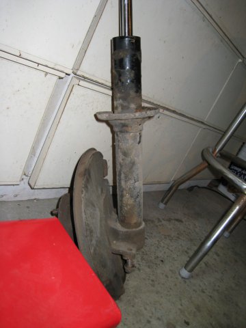 While swapping strut cartridges i came to one that seamed to be welded in, it was so tight. I was just about to get the drill, to put a hole in the bottom so i could punch the cartridge out. Then i noticed that the right front strut was bent (same side that had the bent strut rod). The mount was also impregnated and imposable to put back on the car. So in 8 days i should have some new ones.(the 280z ones are even worse) I grabbed a strut from the 280z and stripped it down and cleaned both of them up. I use industrial strength simple grean. Its bio degratable and very very strong. I do 25% simple g and 75% water for most things. If its really grimy ill do a 50-50 split. Just be careful with soaking stuff in a strong mix. I soaked some hardware over night one time and by morning it had eaten of the finish. Today i got a lot of painting done. It was mid 80's and 8% humidity in sunny San Diego making the paint dry so fast that i got about 8 coats done today. the new master too