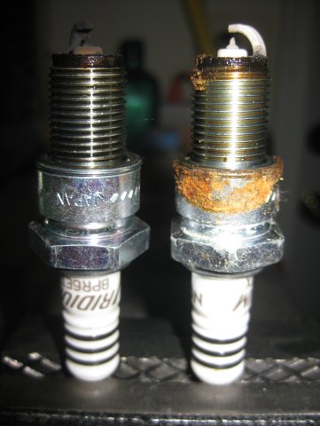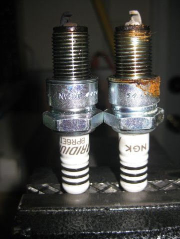 I'll be the first to admit I'm a newbie on reading plugs, but this one's got me. Take a look at the right-hand plug...I'm going to go with way too lean, but why would the brown "crud" move that far down the plug?