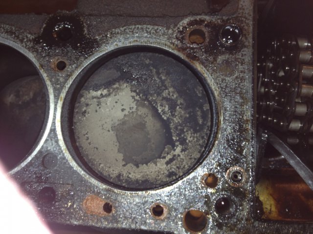 Thought I'd add a little update. I managed to break down most of the rest of the short block, and got the timing cover, chain, etc., off, and also pulled out the pistons. Of particular concern was that when #1, #3, and #5 came out, the top compression ring was broken. They literally fell off as I slid the pistons out. Something tells me that's not a terribly good thing, but I took a good close look at the cylinder bores and I don't see any scoring or gouges...they're all smooth as a baby's butt and I can still see the cross-hatching from when they were either re-honed, or originally honed at the factory (no idea if it's ever been rebuilt). Finally, in the category of "things I'd prefer to not find in the oil pan", check out the attached pic.