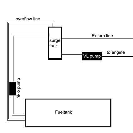 Great test thread. Surge tank, fuel injected motors need one and it needs a low pressure pump to feed it from the fuel tank and then a high pressure pump to feed from the surge tank to the motor. The surge tank is simply there to insure that the motor never suffers a fuel pressure drop, especially in the corners, otherwise pistons start to melt. The fuel is fed to the surge tank and filled to capacity, the high pressure pump feeds fuel down a large fuel line to the motor fuel rail. The excess fuel if fed back to the fuel regulator from the fuel rail middle fitting. The fuel regulator limits the fuel back pressure, approx 15psi, and feeds the excess fuel back to the surge tank through the return line. The PDF diagram enclosed shows the lines and fuel direction required. Mine might be unduly complicated but I'm overbuilding the whole car. Z Fuel System & Oil Cooler.pdf (DR).pdf