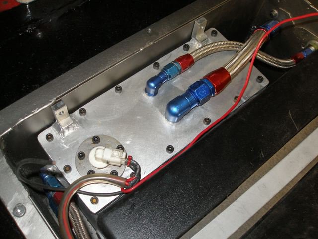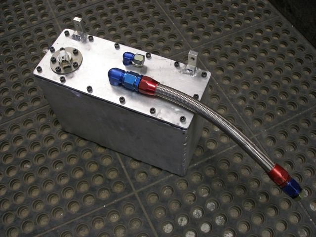 The surge tank/swirl pot is always kept full to the brim by the low pressure pump from the fuel cell and the return line from the fuel regulator returns back to the surge tank/swirl pot as well insuring it's always full. The high pressure pump insures that the fuel injectors always receive high pressure fuel but the regulator controls the whole systems pressure, effectively applying "brakes" to the whole system. The high pressure fuel pump can't override the fuel regulator so the high pressure fuel pump just doesn't work as hard. Installing two high pressure pumps in series won't increase the pressure, just give you added insurance should one fail. I should have put a low pressure pump in the fuel cell but just installed two of the same since the fuel regulator will determine how hard it works after it's filled the surge tank/swirl pot. As long as your surge tank/swirl pot is big enough, once it's filled you won't ever use enough fuel to empty or even partially empty it since it's constantly resupplied by both the fuel cell and the return line from the fuel regulator. More info cut and pasted from the net: Fuel Surge Tank Vehicles fitted with EFI from the factory have a surge tank in the fuel tank - so when you’re accelerating or cornering, fuel can’t rush away from the fuel pickup, causing the engine to stall or surge. Surge tanks for high hp applications (700+WHP) need about 3.5 - 4.5 litres. • EFI uses an electronic fuel pump, and the supply lines after the pump are pressurized to around 40-60psi. That’s a LOT! In most cars, the electric pump is mounted INSIDE the fuel tank and pumps fuel up the length of the car to the engine's fuel rail. So this means that you have 40-60psi pressure on the fuel supply line from the pump, right up to and inside the fuel rail. The fuel rail holds your fuel injectors onto the intake side of the engine and houses a volume of fuel under pressure, which flows through the injectors and into the engine when the ECU tells the injectors to open. Pressure is maintained in the fuel rail by the fuel pressure regulator, which has a mechanically controlled diaphragm that allows excess pressure (fuel) to escape, and in doing so maintaining the correct pressure within the fuel rail. So the unused fuel flows out of the fuel rail through the fuel pressure regulator, and back into the fuel tank.... and the cycle continues. In a carbureted fuel tank, when you have a light fuel load (less than a 1/3 of a tank) the pick up line will frequently suck a pocket of air. With a carburetor this is no problem because the float bowel holds a fuel reserve, but with EFI there is no factory fuel reserve and a moment of reduced fuel supply with cause the engine to fuel starve, run lean and possibly break. Now a little about EFI fuel pumps.... There is a reason they are usually mounted inside the fuel tank - THEY DONT SUCK GOOD. Unlike a mechanical carburetor pump, they aren’t very good at drawing fuel out of the tank... they are useless at it. Fuel almost literally has to be poured into the inlet of the pump - you'll hear the term "gravity fed" used to explain this. By having the pump inside the tank, the inlet is submerged in the petrol right at the bottom of the tank and thus gravity is forcing the petrol into the pump. So THAT'S why you need a surge tank! Basically they are a secondary fuel tank you can place somewhere suitable to gravity feed the EFI pump. Of course somehow fuel needs to get from the fuel tank to the surge tank - this is where an electronic carburetor pump, or "lift pump" is used. These are a low pressure, high volume pump that CAN suck. MAKE SURE to use EFI fuel hose for any rubber lines after the EFI pump. Carburetor fuel lines can’t handle the high pressure. Some places also have "EFI" hose clamps... these are just normal hose clamps with beveled edges and solid clamping face that doesn’t bite into the rubber hose at all. You MUST use a carburetor fuel filter before the lift pump (an EFI filter provides too much restriction), and an EFI fuel filter after the EFI pump (a carb style paper element filter is of no use against the higher feed rate of an EFI pump). As such dedicated Pre Filters are available to screen out foreign matter without restricting flow. For ease of installation, a 300zx style EFI fuel filter works well, having barb fittings at either end. Simply chucking an in-tank EFI pump into your carburetor fuel tank won’t always work.... in most EFI tanks there are baffles that keep the fuel around the pickup of the pump to avoid starvation when the fuel is low and you are cornering. Most people put baffles in themselves or make a "swirl pot" - a small lowered pool at the lowest point of the tank where the inlet of the pump is then put. Doing this yourself is EASY. Just be careful, and make TRIPLE SURE you know which line is which when you are attaching hoses!! Pump selection, When choosing your lift and main pumps its a good idea to ensure your Lift pump will slightly outflow your main pump, keep in mind this is flow not pressure. Your lift pump needs to be able to supply enough fuel all the time. I don't think a weld in sump and fuel tank baffling is the best idea, I still don't like the idea of a ton of fuel pumps. I think that one pickup pump from the gas tank feeding one decent sized surge tank (doesn't need to be huge) and one single high-flow pump from there to the engine. As for a lot of ss hose...there really isn't any other option if you want the best fuel system setup. Although I have seen one fuel surge tank setup that used mandrel bent tubing with compression fittings rather than hose, this would be lighter than all SS lines, but much more custom work would be involved. http://www.sdsefi.com/techsurge.htm Step away from the Walbro. Get a NISMO pump. You will probably not be running your 720cc injectors at 100% for any duration of time, so the NISMO will do just fine. FYI for my use we used two NISMO spec. pumps but that was 