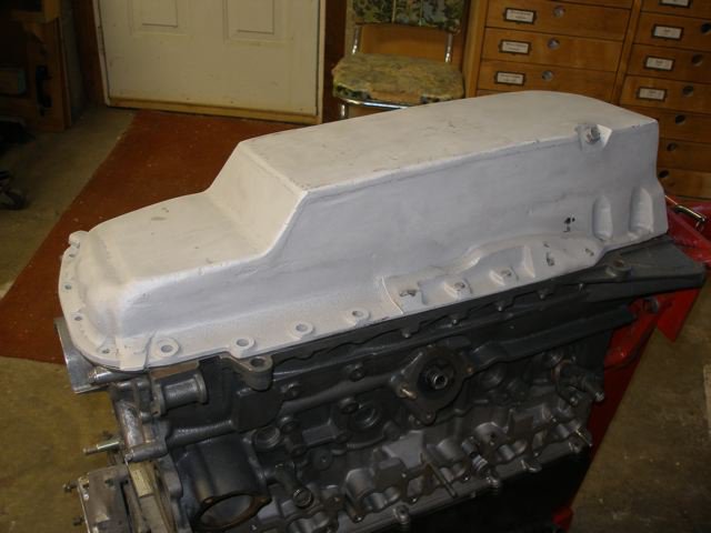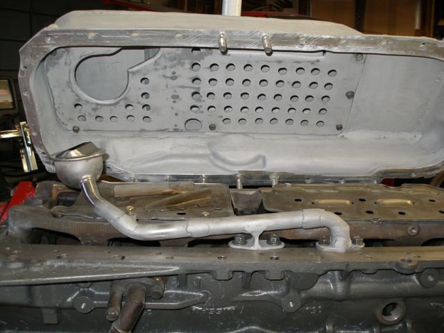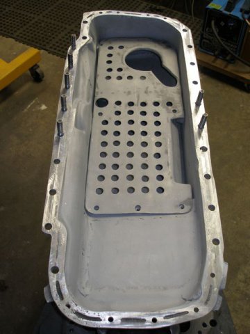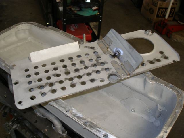 I finally finished my rear sump aluminum oil pan and steel baffle with one hinged plate. The oil pan holds about 7.5 litres at the stock dipstick level and the baffles should be able to contain an adequate supply of oil around the pickup. It's not beautiful, my first attempt to weld aluminum. I used the base for the stock oil pan as well as the oil drain plug.