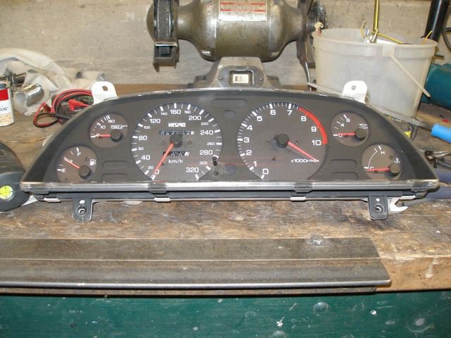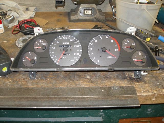 I searched the threads and read Chris's wiring thread through but couldn't find a reference to anyone installing and wiring a Skyline gauge cluster into a 240z. I could build a cap for the gauge cluster and replace the stock speedo/tach pods. Has anyone tried and how tough was it to wire? This cluster came with my motor and I like the aftermarket high speed speedo and higher redline tach but they can't be separated, they use a flexible circuit board. I may have to replace the stock gauges in the dash with aftermarket, but an interesting aside. I put a dash cap in my car and then put the roll cage back in. To change the gauges I'll have to take the cage out again because the dash cap gauge surround is smaller than the gauges and doesn't allow them to come out the front! Damn.