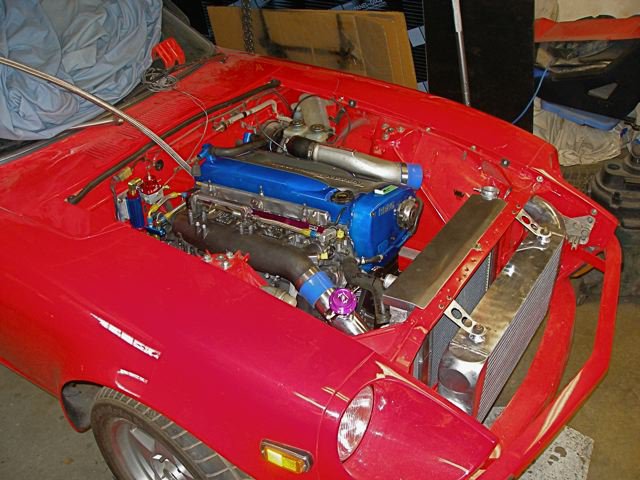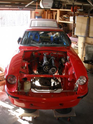 Thanks for the photos. It's a lot easier to work on without any sheetmetal. Years ago I added 2 1/4" square tubing within the existing unibody frame rails, extending it with rectangular tubing back to the diff and then extra metal around the strut towers and braced them as well. I remember being really nervous about relocating the suspension points and the crossbrace and hoping that it was all going to be square again! It was. The frame rails weren't rusted, I just wanted the chassis really stiff, the car handles like a slot car. My friends used to come and watch me braze. I'd broken my hand skiing and the cast and bandages kept catching fire while I brazed, but I just plunged it in a pail of water and kept brazing! Now does anyone else have any photos to offer of a less ambitious transplant possibly using the stock intake manifold and the resultant coolant and vacuum lines? -