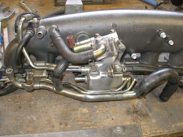 Mike, I didn't mean to download that file, but I have perused all of your build files and they helped me along the way. I'm just sorting out the air cleaner input and I think for now I'll have to get by with two conical air filters just behind the radiator and under the turbo air to intercooler pipe. I'll build an aluminum box/heat shield to force as much cold air as as possible from the lower hole in the rad support. I wanted to put the air filter in front of the rad support like I had with my 3.1 litre stroker but I ran out of room. It's a tight space. I just want to get the car running and then I'll look into new intake and turbo to intercooler piping. There are so many Z RB26 conversions out there I'm hoping more will share their photos and experience with removing the coolant/vacuum lines. NZeder, where did these dcoe's throttle bodies come from? Are they Webers? On my 3.1 litre my Weber 40 dcoe's weren't big enough and I had to change to 45 Mikuni's, big difference. A Z that got 13 mpg! I've enclosed more photos of the vacuum lines both on the block and the spider. Of the two connectors on the front of the intake manifold throttle plate there are two electrical connectors, the yellow one is the engine temp sensor. What's the other one? -
