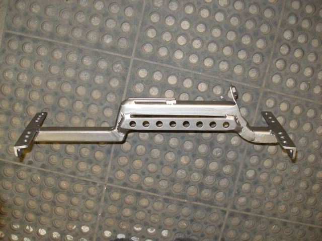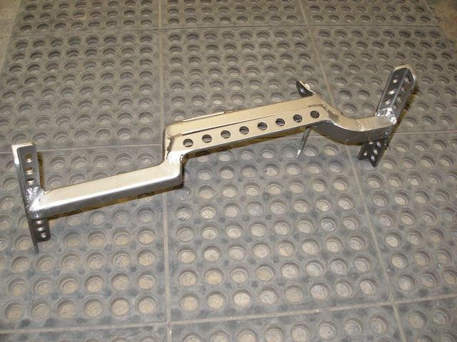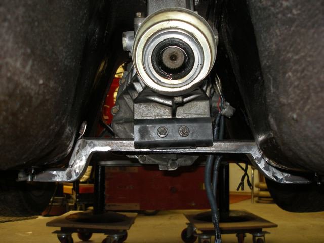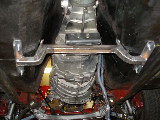 Enclosed are a few photos of my transmission mount. I cut the transmission tunnel ears off and built from scratch. I modified the mount to allow a 3" exhaust above the mount, added extra bracing and drilled holes to "add lightness" before painting and after the shot with the mount in the car.