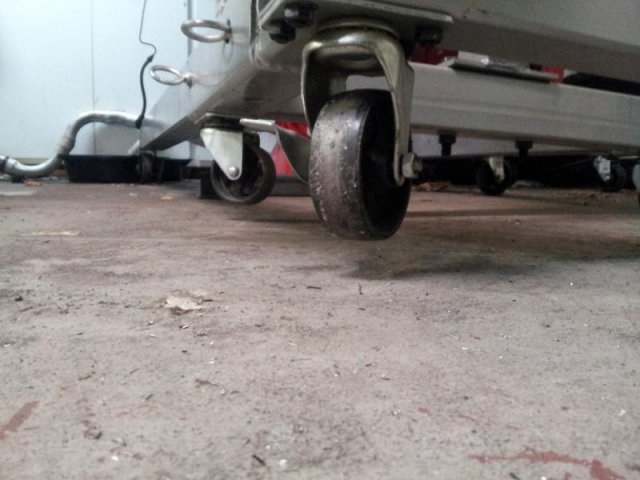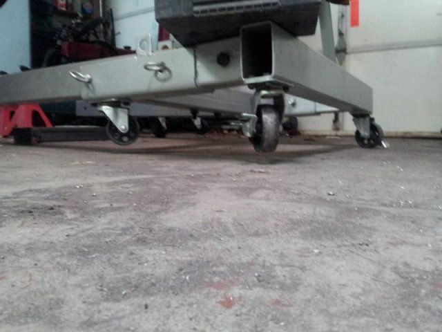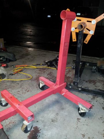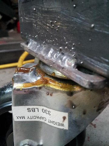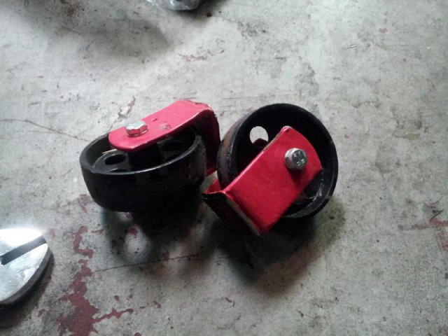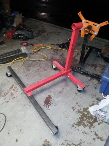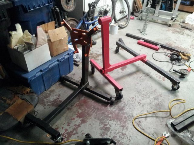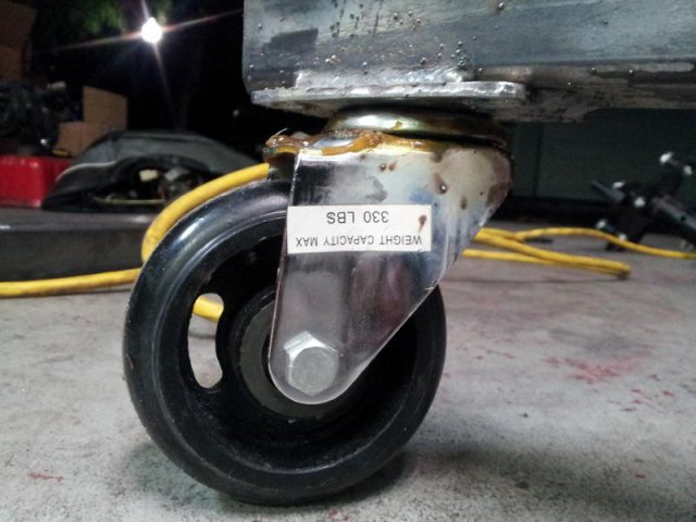 There's probably dozens of these posts, but I thought I would share what I consider to be a unique twist on the rotisserie. Basically, I started with two engine stands, the four wheel kind. I decided I wanted to be able to pull the car around my garage any direction and wanted heavy duty casters. So I said to hell with it -- I have a welder, so why not? I wanted the option to be able to work on the vehicle's interior while on the rotisserie. As in actually climb inside to an extent without risking it tipping over. And so this idea was born. I would widen the front beam of each engine stand and probably add length to the main vertical engine support to allow complete, 360 degree rotation (yes, I pass AWS certified bend tests for butt-end welds). I chopped off the metal casters and non rotating wheels, lengthened the front bar, and welded on the new 330lb caster (engine stand each rated for 1000). I'm in to it: $30 orange engine stand $35 engine stand $100 even (WITH TAX, lol!) 1.5 x 3 x 1/8 inch tube, 2 x 2 x 1/8 inch tube, 3/16 flat stock 18 x 18 inch, 22 ga CR steel sheet for body work. $50 in casters First off is to get rid of these. Here is what I started with if you imagine it under the forward support, lol. Here is what I got. Cheap HF casters. $6 each I should have used my stick welder instead of my cheap $90 HF mig. But not bad welds for a harbor freight tool with no bottle setup. Garage is a mess... :-/