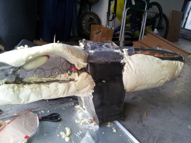 Plastic piece leftover after the pour. The cardboard is what I use to keep the foam from expanding really think, and instead expand vertically. The foam actually exerts quite a lot of pressure, and when pouring this stuff in pontoons, they have to cut relief holes to keep it from damaging the pontoons. A little behind the scenes sneak peek at what the metal work looks like. So glad that is done! A heating technique to preheat the metal, then keep the foam warm for maximum expansion and curing speed. It's amazing the difference heat makes. I wasted so much of this stuff by not knowing how to pour it correctly the first few pours. By the time I got to this part, I was spot on pretty much every time.