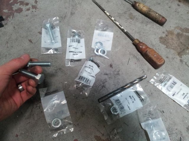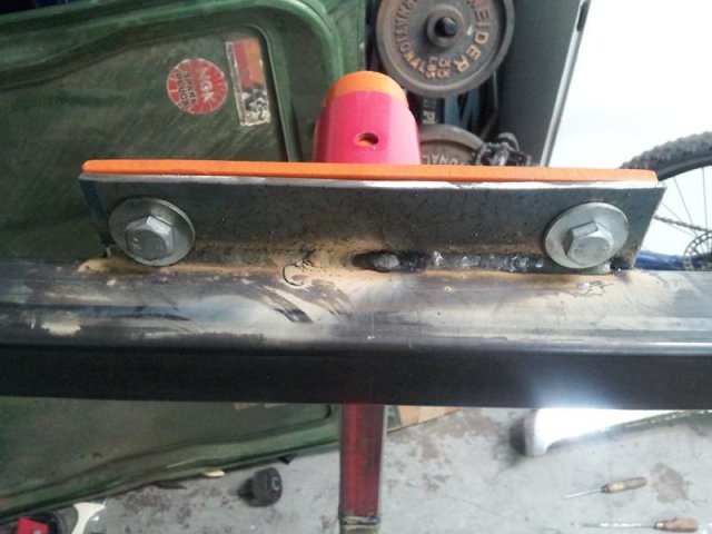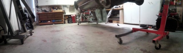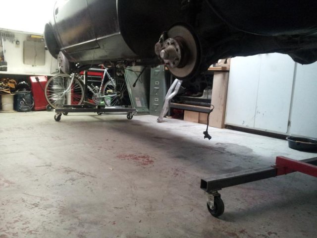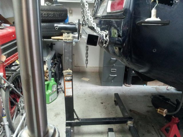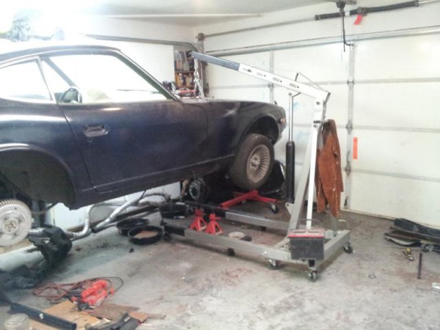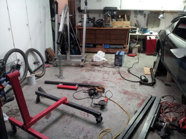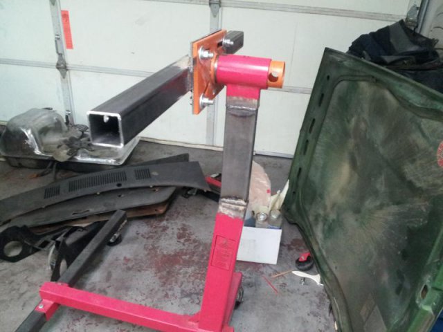 Here's a little update on the rotisserie... It is...Done! Got it done yesterday (my day off from studying). Here are the pics. --------------------------------- Drilled holes for attaching to the bumper mounts. Here is the front stand with the bar attached for testing. The 3/16" plate has to endure 800 pounds of torsion and shear stress. I wish I would have overrated to 1/4", but the solid bead all around should hold it pretty darn good. Ahhhhhhhhhhhhhhhhhhhhhhh. Garage is such a mess I can hardly stand it (I'm a little OCD). Oh yeah....and the car rear is up. Lol, I didn't extend the hoist legs enough (because the engine stand and hoist wouldn't fit there together), and I had to stand on the hoist to keep it from tipping over with the car on it. A rear-end view... A close up (errr....). Notice the stand vertical bar looks bent inward, but in fact the top half I welded on is straight up and down. The bottom half is bent back for better balance with an engine on. $17 worth of mounting hardware... Worth it for the strength. Mildly sketchy, lol. The perils which the hoist and operator hath endured whilst raising the fore of the vehicle shall not be mentioned. But yes, that is a car battery helping to weigh down the hoist, lol. The problem is the hoist legs don't fit under the car with the stand legs... Since the stand can't really move, the hoist has to. Yes, the car is currently being lifted with this hoist... lol Ahh, but the results... And the grande finale: In hindsight, there are a few things I would do differently. I definitely underestimated the physics of a car suspended in the air. I feel everything will hold find, and the material chosen is rated for the weight, but... 1. I'd use 1/4" for mating the plates together, not 3/16" as in the pics 2. I'd upgrade to 6 inch casters. Rolling this thing is still hard, but possible. 3. I would add corner brace supports from the vertical to horizontal leg bars. Not just one in the direction of the load, but for side stress as well. Basically three angles brackets per vertical support. I might still do it, but worried about welding when the car is up. Just some insurance. 4. I'd make both the leg bars 4 feet wide. It's just hard to do when your garage is small and you know you have to break it down eventually