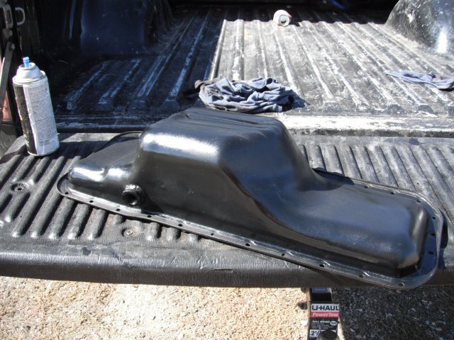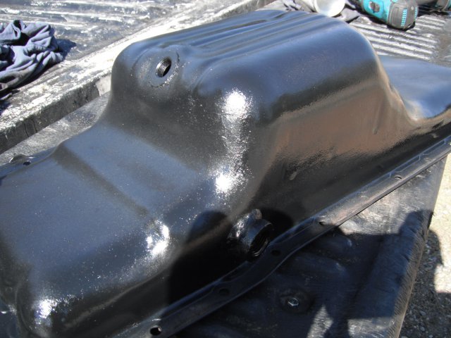 Fuel delivery and engine management aside, here's the latest: Oil pan unglued from block (fun), cleaned, painted, new bunghole! Final (hopefully) mounting of turbo, manifold, downpipe, and oil lines.