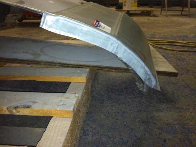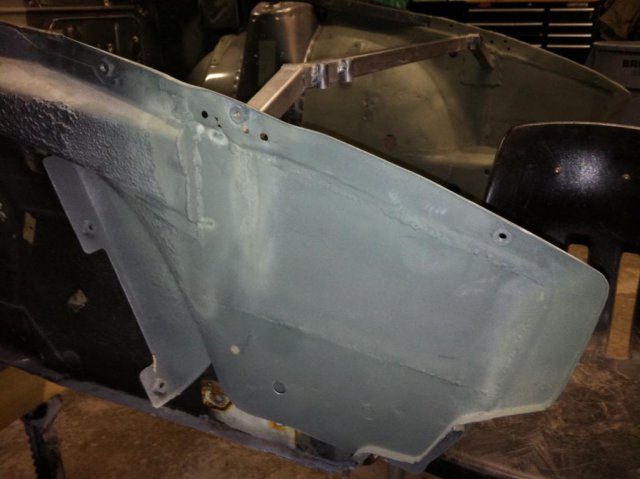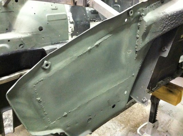 I have been collecting my body parts together for the big repair job. I want to try to do this in a faster manner than some of my last stages. I tried the Tabco dogleg panels in basic fitment. They seem to actually fit quite well in shape and curvature. The pinch weld needs bent in a bit more and trimmed so it is parallel with the ground, but that is not too bad. I did notice from all the Tabco panels that they seem to be formed from a mask made over the original part. All their panels seem to be able to fit OVER the existing pieces rather that fit in place of them. I am not sure how badly that could trip someone up. I also got a lower rear quarter repair panel. It is terrible and doesn't fit well at all. I will probably sell that one. I don't have the time or skills to work it in. Likewise, the lower fender repair panel lays neatly over the bottom of a stock fender, but that is mostly OK. The MSA rear lower panel (below tail light area) is only curved in the vertical plane. It does not curve out from left to center and back in from center to left. The panel could be fit in place since there is nothing that it welds to on the bottom (and the top is mostly straight). I suppose you might be able to work it with english wheel type tools, but the panel is very thick and heavy, so I am not sure that would work. I ended up buying a cutoff for that area. The replacement floor pans are very thick in comparison. So is the Bad Dog frame rails. In some manner I need to fabricate a reinforcement hoop around the trans tunnel where the RB trans will mount, so these parts are necessary for that, if not for replacing the few rust spots. Realistically I could merely do a ~8"x8" square on each floor pan and pull the frame rails back down where they are smashed in and I would be have acceptable strength for what they are, but I want it solid.