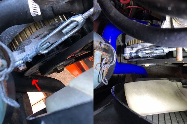 Working on radiator hose. The Big GM alternator is hitting radiator hose and coolant get leaking. Entire engine bay was splash with coolant This is the problem. purchased eBay radiator hose. https://www.ebay.com/itm/Silicone-Radiator-Coolant-Hose-For-NISSAN-DATSUN-280Z-Z-S130-L28-1975-1978-Blue/253940447076?ssPageName=STRK%3AMEBIDX%3AIT&_trksid=p2057872.m2749.l2649 The lower hose shape is different from OEM one. Before and After. The new hose is not touching alternator at all ! Looks good on blue also, I build ramp with some spare woods. Now I can jack up my car.- 230 replies