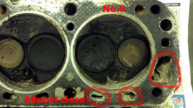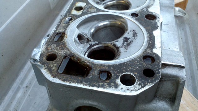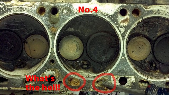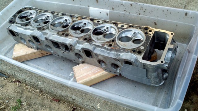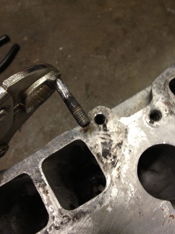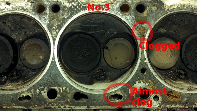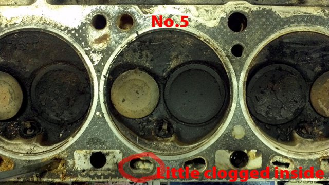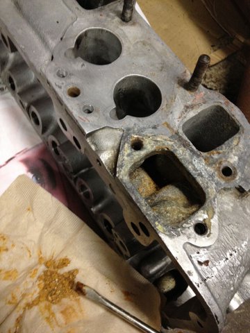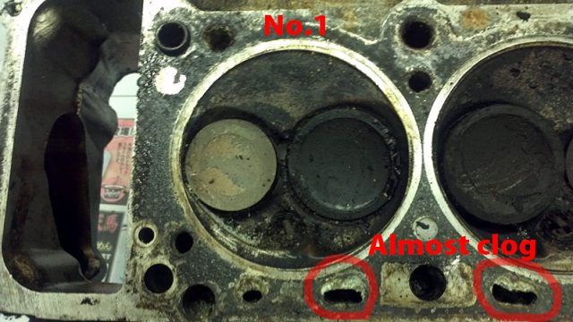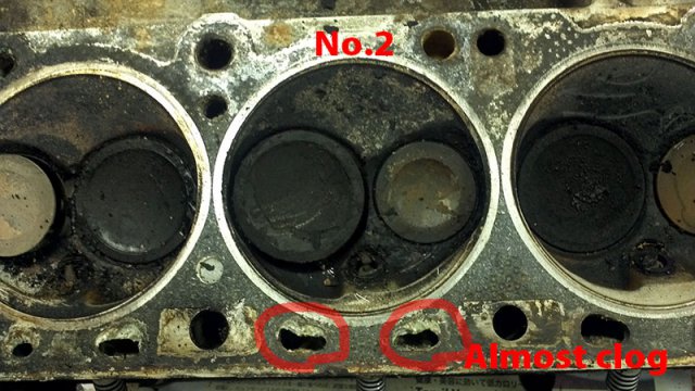 Over the weekend, I had time to wash N42 head with boiled hot water with parts washer fluid. Clogged carbon is hard to removed. I need to dip parts longer time with the liquid keep warm. I need this bucket heater to keep liquid warm. http://www.amazon.com/MARSHALLTOWN-Premier-742G-Bucket-Heater/dp/B000BDB4UG/ref=wl_it_dp_o_pC_nS_nC?ie=UTF8&colid=2QRZ54ZT313XU&coliid=IYUXNWSETECSP Anyway, stinky old oil smell is gone from my garage at least at this time. After head washed, I try to removed stud. Using heat gun to heat up stud 10 minutes, put ice cube to the stud to cooldown to creat gap between stud and head. Jaw lock plier to twist to remove the stud... some of them are easy to take it out, but others are so hard! It took more than 30 minutes to remove hard one. After flashing head and blow water by air compressor, I noticed clogged antifreeze. I don't know what is the best way to clean up this clogg. Any suggestion?