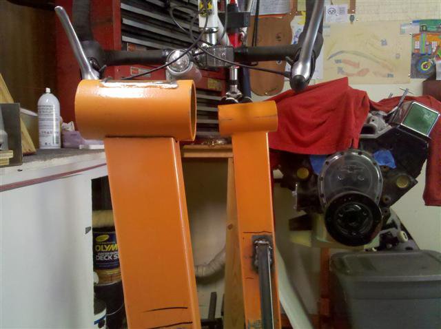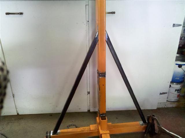 Okay, so that was a long WEEK! Actually four weeks time has passed already....So after a broken rib and a couple of weeks of taking it easy around the garage, I finally put together the rotiserrie stands. I had to adjust the angle of the sleeves which the mounts will be rotating in. The angle was too great for my liking. Knowing there will be a little flex (towards car) in the upright when under load, I welded the sleeves a degree or 2 out of level--sleeves are just a tad higher on the side facing the car. Tomorrow I will be fabing up the front and rear mounts so I can be working on the floor pans over the next month. The third picture shows the difference in angle after I cut one of the sleeves off and left one in the original position for comparison....really shows how much angle is built into these engine stands from the factory.