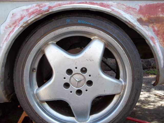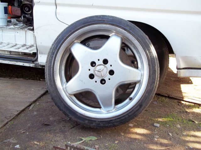 Well I have changed my mind on the Starion wheels and Z32 brakes for now (because I would have to flare the fenders and more) So I went back to the big 14" Brembo brakes and the Mercedes Benz 18"X8.5" rims with small 225's on them now. I have coilovers and camber plates also put a half inch spacer on all 4's and went long ARP studs and had everything redrilled for the 112mm X 5 lug pattern. I checked the ground clearance which for now will be 5.5" (stock is 6.3") and when I need tires I will be putting 255/40R18's on them. The machine shop has been pushing the work for the last 3 weeks but claims that everything will be done next week...YEAH Also I am either going to polish these or powder coat...Have'nt decided yet. Below are pictures of both Starion setup and the Mercedes setup. -