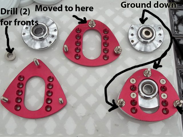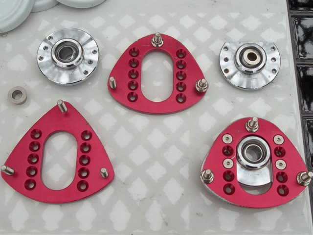 Did my custom camber plate (medieval style) I started out with two pairs of BMW front camber plates see pictures PS the two front bushings that I have to drill out was due to using MR2 Rear Struts... -