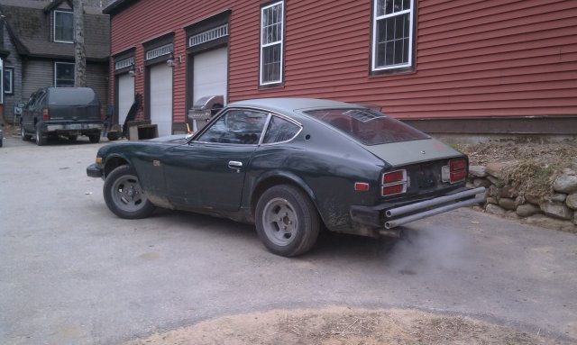 I guess now is as good a time as any to start my build thread. I got My 75' 280z nearly a year ago in December of 2011 with no brakes and an engine that didn't run. We trailered it to my friends house where the car currently resides the same day I bought it. Things, however, got slightly more complex after that. A week later I returned to get the Z off the trailer and into the garage to try and get her to run. After getting it off the trailer we had to tow it up his driveway to the garage but unfortunately the tow hook we connected to his 87' civic came undone somehow and the Datsun started rolling down the hill with me inside presumably to put the car in gear to stop it. Now I'll let it be known that I had driven one standard car for no more than 10 minutes prior to this experience and frankly, things happened so fast I don't know what else I could have done to prevent it. But what happened is what you see in the pictures below. After lots of back-hoeing, anticipation, and stress we got her out of the ditch but not unscathed. Luckily for me the previous owner was so kind as to put 2 MASSIVE steel pipes in place of the rear bumper which saved my window as well as the entire rear end of the car from a tree. So now I was left with a damaged 280z that didn't run or stop. And the work began. We began by replacing the AFM rubber intake boot as well as standard tune up stuff and a new Fuel pump. After some fussing we got her to run and after replacing the master cylinder and brake cylinders she was stopping as well. Eventually I got around to finding a new Hatch and did some body work. After that I studied abroad for the summer and was unable to work on the car for 3 months. But upon returning I put new stock brakes all around and started more body work. Recently I came upon a bunch of extra parts, a lot of them being 240z parts. And I have started transplanting them onto the 280z. I got a 1st generation hatch, taillights and a 240z engine that has an E31 head. I have the hatch installed and got the latch to work again. currently the lights are only mocked up. I plan on using the engine but that will be in the future when my 2.8 dies and when I have the money to build it. Right now Im trying to get the taillights done, straighten out the body, and fix anything else that it needs to get inspected. The house my car is at has pretty much a full garage. I also have access to a lot of other tools so I am hoping to do a lot of fabrication of parts myself whenever I can. Personally I am better at woodworking than anything else so I am looking forward to applying that to the car. I know this is a long intro but theres definitely a lot more to come.