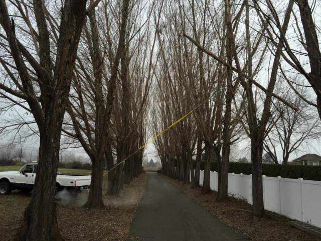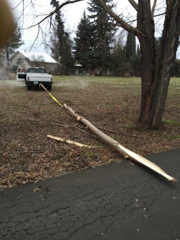 My driveway is tree lined and we continually have branches breaking and falling. In some cases, as shown in the photos below, they don't make it all the way to the ground and need a little help. This one was about 5-6" in diameter and 25' long. I just wish I'd video'd how it came down because, at one point, right after it speared into the ground it looked like it was going to fall back across the neighbors vinyl fence. That would not have been good for the fence or for me. fortunately my son gunned the truck right then and the limb let out across the road.
