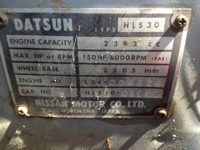 OK, Here is the scoop on the car. It has no title - the owner lost it. It can be retitled here in WA if the car is running and can pass a state mechanical safety inspection. That will add cost to the car if I have to do it. I'll add several pictures but here are some bullets: VIN HLS30-01779 Mfg 2/70 Color code 901 - metallic silver Black interior 4-spd Dealer installed AC No radio Dash is cracked but not decimated. Could be "preserved" and look ok. It has a complete center console in decent shape All gauges but don't know if they work or not Battery is dead Mechanical fuel pump has been bypassed and the car has an electric fuel pump Gas tank is fouled so fuel filter plugs almost instantly Front fenders and hood are original and undamaged with only ome light supervicial rust in some areas. Front bumper is straight and shiny Rear bumper is straight but "carbon monoxide oxidized" All glass is in grate shape Gas cap has the chrome locking lever Frame rails, floor pans, spare tire well have light surface rust but not rusted through. Bad nes stuff - someone put a sunroof on the car, both rear fenders have rust through spots on them and the lower sill of the hatch opening has rust.