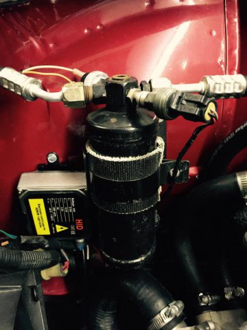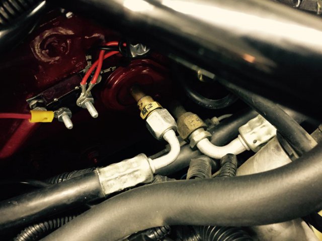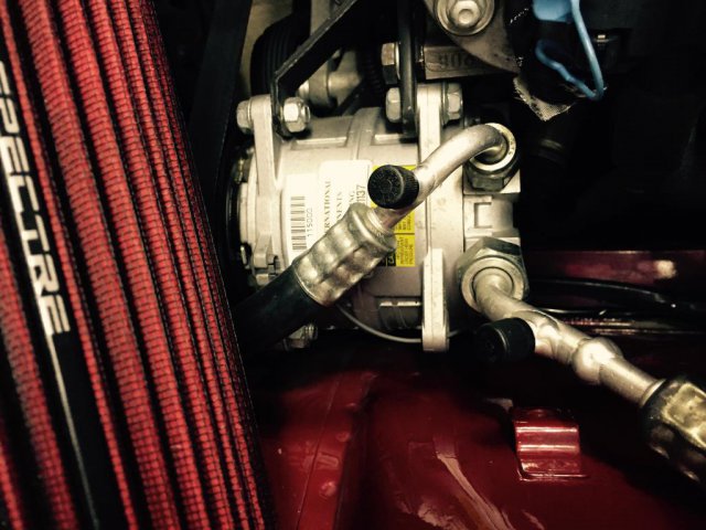 Here are photos of the routing of my AC hoses and position of the compressor and drier. Flow on the condenser is from the driver's side (compressor discharge) to the passenger side through the drier.