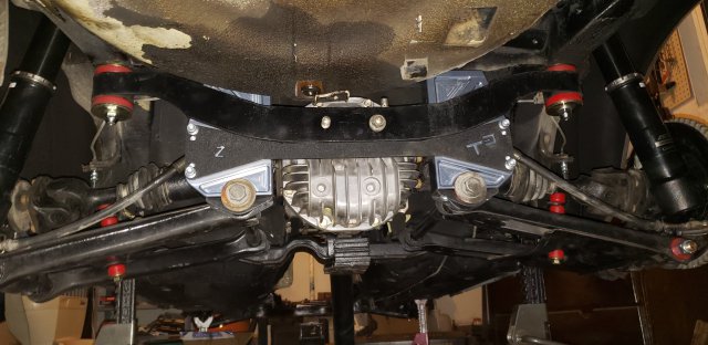 Long day. Front lower mount of the diff wasn't bolting in. Dropped everything and realized that the passenger side bolts weren't even starting. Bought a tap and die set that I had needed anyway and chased the threads. Finally bolted up the rear, then bolted in the rear control arms and coilovers along with brakes. Only thing left is the sway bar and brake hoses which should be done tomorrow. After lots of debating (which I do a lot of with pretty much every decision on this car) and using @seattlejester as a sounding board for the millionth time this month I decided to get the T3 drop mounts and dog bone to fit the finned cover. I could have run the smooth cover, or just cut the brace of the stock drop mounts and sourced the old makeshift braces a user here had made a while back, but I figured if it's something I'll be upgrading later, I might as well get it now. I was concerned that it wouldn't fit with the stock mustache bar since that's not really a weak point and I have better things to do than spend an extra $300 on bling. Wasn't fitting at first and I was feeling disappointed.... until I realized I had left the nuts on the mustache bar loose to line up the bolts up front. Serious facepalm moment. It just barely touches, tight fit, but it'll work. Buttoning up the rear suspension and brake lines tomorrow, pictures to come. We're going places people! (Not literally... but places none the less) -