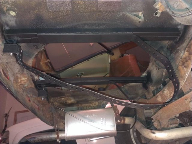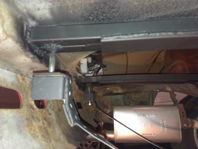 Huge progress made today. The rails I made for the '02 Camaro fuel tank were finally welded to the car's frame. I can't seem to find most of the pictures I had of them, so these will have to do for now. Remember, this is just one way to do it that I think will work for my purposes. Others have tried other ways successfully. Unless some other way doesn't actually work, no person that has done this is necessarily more correct than another. (I will edit this post in the future if I come across more images, and will turn it into more of a write-up when I have time to make more diagrams with approximate measurements) Each piece is two 1" square tubing pieces welded together. There is a bolt on only the rear end closest to the back of the car. The 2" wide barstock is welded directly onto the tubing until the spot in towards the front of the car where the tank's shape starts to curve downward (closest to the welder in the picture). The bolts are about 4" long and are welded in the centers about 2" from the end of the tubing. Friend hard at work, getting it done even despite the horribly awkward angles he was welding at: The centers of the two rails are about 17 1/4" apart from each other. They will seem sharply offset to the right because of the position of the spare wheel well. In reality they are only offset 2 or 3" to the right of center to allow a buffer zone between the tailpipe/muffler and the actual tank once mounted. Super quick video explanation. Pardon the very quiet audio, filmed kinda late and my dad wakes up at 3:30 am, so I was trying not to be too loud. My phone is also 3 years old and doesn't pick up everything very well. I painted over them earlier with some flat black Rustoleum automotive enamel I had lying around the garage, then waited for the paint to dry before mounting. I'm no professional, and I think the rails got bumped slightly at some point, making this a super tight fit. Not quite the super clean fit I hoped for, but it feels incredibly sturdy. Here's more detailed pictures. Driver and passenger sides Underside, a closer view at the covers I welded over the barstock for a cleaner look, and the L brackets on the end with side covers. Top and bottom view after mounting. (including a nice look at my rusty paint ) If it looks a bit far back it's because it is. If it was any closer forward it would almost be touching the tailpipe. Edit: Video is now up. New pictures posted. Also added a random picture of my buddy in the process of welding. -
