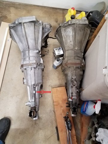I recently acquired a late model FS5W71B 5-speed that supposedly came out of a 280ZX. It definitely has the right bellhousing bolt pattern, the single ear exhaust hanger, the reverse check plate, and the tall ears for the shifter. I've put it in 5th and counted input shaft to output shaft ratios, and confirmed it's the .745:1 5th gear. Based on the research I've done on this site and others it sounds like it should bolt in just fine, but I need to make sure I use the pressure plate and throw-out bearing out of either one or the other and not "mix and match". I have a completely new clutch/PP/TOB (Exedy) that I had bought for my 4 speed, and am guessing that it should be OK in the 5 speed? Can anyone confirm this? Also, the breather has broken off flush with the case. Any advice on removing the stub? The 5-speed came with a slave cylinder, should I use that one or my 4-speed's, or is there no difference? Looking at this web link http://www.atlanticz.ca/zclub/techtips/shifterbushing/index.html I do have the weird oblong shifter (bottom picture, right side) from the 5 speed. Does anyone have any idea what that internal spring is supposed to do in relation to the bushings? Is it one of those push-down to engage reverse features? Finally, this transmission only has one electronic sensor installed, up near the front (Reverse switch I believe), and nothing else. There looks like maybe something should be in the rear, and possibly got broken off. I need to do more cleanup in that area to be sure. I downloaded a copy of the '83 FSM from Xenon and the MT chapter shows 4 sensors! (Reverse switch, Top Gear Switch, O.D. Gear Switch, and Neutral switch.) In all the pictures of these transmissions I have found on line I have never seen 4 switches installed on the side of these transmissions. Does anyone know what the deal is on what reality appears to be VS what the FSM is calling out? In my picture the 5-speed is on the left, the 4-speed is on the right, The shifter with all the tape around it is the oblong one out of the 5-speed. The boss that is up from the tailshaft on the right of the center casting part line (red arrow pointing to it) is full of crud and I suspect where the neutral switch should be installed. Is there ANYTHING that anyone can advise me on in regards to making this swap successful? Pitfalls? "Gotchyas"? "As long as you are doing this you may want to..."? Thanks!