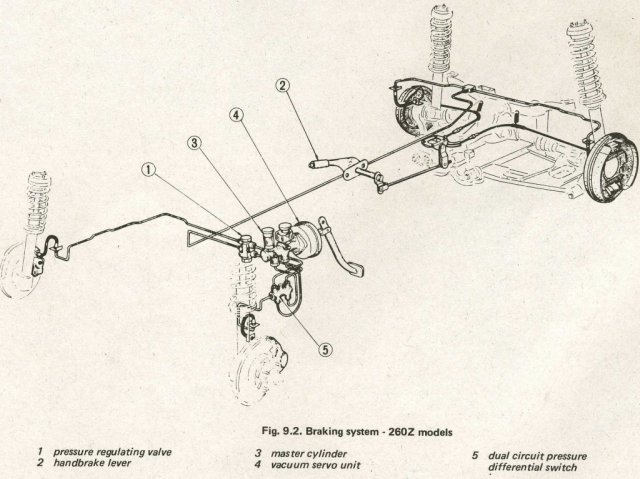 I came into possession of a brake booster and master cylinder from a 1992 BNR32 gtr front clip. That may not sound helpful, but it is. You see the booster and the MC are both available on USDM market vehicles. The MC is a common upgrade for the 240sx group. I think its a Z32 non-abs MC. The power booster is from a 240sx I believe as well. The Q45 booster might work. I had one around and it looked to be a slightly larger diameter, but it appeared to clear the clutch cylinder. For reference I here is my first thread when I started. This is not a bolt in though. I cut a piece of thick paper into a template. I placed the template over the bulk head and marked it out. The only stud I had a clearance issue with was the bottom right stud. It was very close to the pedal box wall. So I ground the pedal box enough to get the nut and washer on it. This particular MC has the proportioning valve and such built into it. Thats great because I was able to just pull out all the extra brake system crud in the engine bay. The front line is the rear brakes and the 2 rears are the left and right. Simply run the 3 lines out to the brake system and eliminate the old Pressure Regulator Valve and Pressure Differential Valve. There was another catch here. No one carries a 10mm line joint for a hydraulic system. Well at least not the common places like Summit or Jegs. I found CSC of Salinas could order them from BrakeQuip. I ordered 2 and used both to connect to the existing lines for the right and rear brakes located on the bulkhead in my 260Z where the PRV was. for brake parts reference: I connected the 'brake' light wire to the new master level sensor. I dont need a light to tell me when the system fails... My foot tells me just as fast. Now I will have an indicator of brake wear as the light comes on and level goes low. Im very satisfied with the results here as well. The pedal feedback is superior to the original and the assist is very adequate. Im definitely ready for rear disc brakes now. I just need to determine if there is a block in the back somewhere that is a metering valve for drums and if so eliminate it. Another upside to this is that the MC and booster are probably more readily available than the original 260z stuff. I havent looked up costs of the MC yet for a rebuilt version, but im sure its similar in costs to the 260Z unit, more available, and now there is less parts in my engine bay to break. Ive replaced both the PRV and PDV once or twice since 2002(but not with new parts). Hope this is somewhat helpful even though its not a full out writeup on the install. Its pretty straight forward to anyone that already knows how to adjust properly and hook up a power booster and MC.