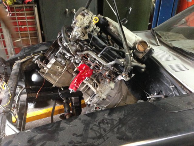 Progress! The engine and tank are in. Tank was pretty easy, mainly because I woke up late and EvilC did it for me... The engine proved to be a little tricky. The issue because of how tight the fit is between the firewall and crossmember, getting the engine to slot in is difficult. We ended up removing the upper intake plenum (after damaging it and the weatherstrip lip a bit) to get the engine to sit correctly. That said, I was hoping for a little input from others who have done the swap here. With the engine sitting about as low as I am comfortable with and as far back as I can it looks like I'll have to remove a pretty sizable section of the inner hood frame to clear the plenum. I am curious whether others have had the same issue or if I'm sitting higher than most. In any case, here are the pics!