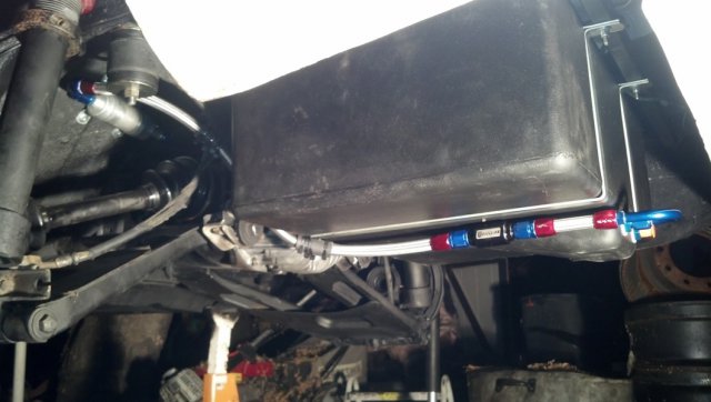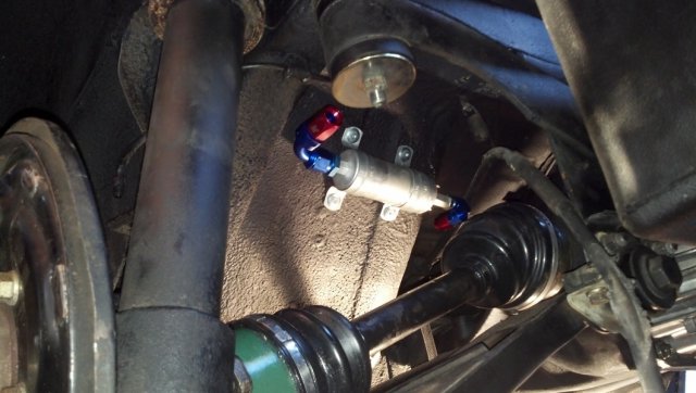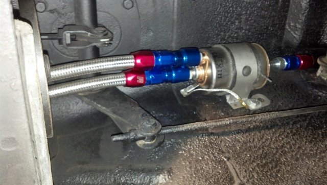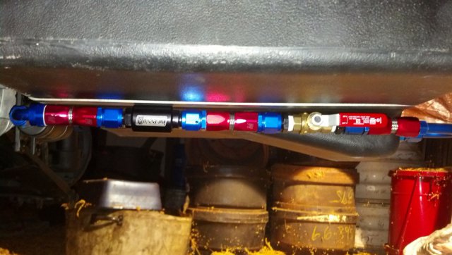 Update: Today I finished fabbing up my fuel pump bracket. It went smooth and came out great. I used 2 lengths of 1/4" strap and a short pice of 90* steel. Then I decided to start pluming the lines to the fuel pump. Boy it was the perfect fit. Not one more fitting could be used haha. I added a fuel shut off valve. Nothing special. Just picked it up at the hardware store. Just make shur it is safe for use with fuel. Tomorrow I plan on installing the C5 fuel filter right next to fuel pump. Will need to fab up another bracket maby. I dont know. Ill figure it out once i get under there again.