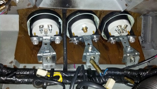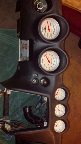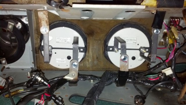 Progress today was minimal. All I managed to do was fab up some littel brackets to mount my guages. I used the original front besels for the smaller ones to fit them in the hole and have the angled effect. I had large gaps on each side of the tach. and speedo. So I used some sticky foam strips to seal and black out the background. It all went well.