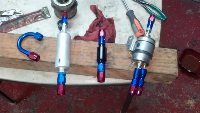 Keith: Ya that dosent sound fun, cleaning it again and agin. Thanks for the heads up! I will see what I can do to fab. something up. It seems like theres more work to be dont on the back end then the actualy motor swap haha. Today I plan on finishing my fuel pump mounting bracket. I just got another package from Summit of some goodies. I bought some AN-NPT fittingS so I can install a shut-off valve for the fuel line, as it was a popular request. Made sense to me. Will update later tonight with some pics.