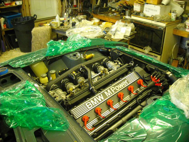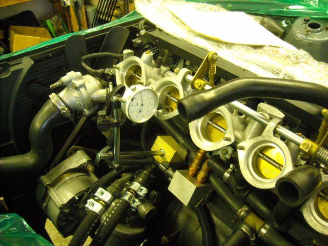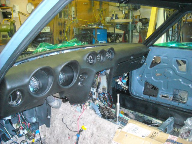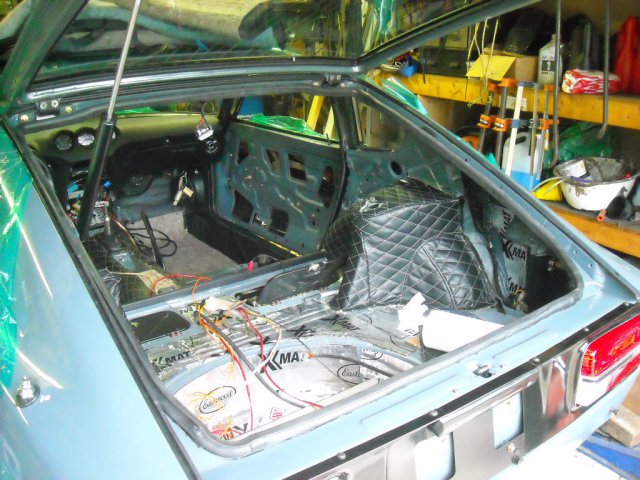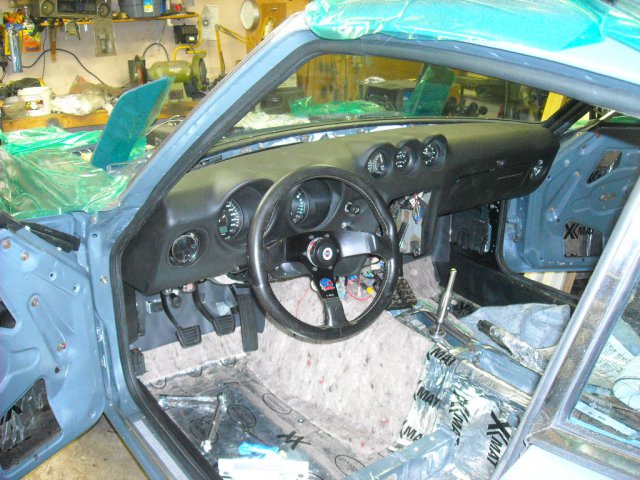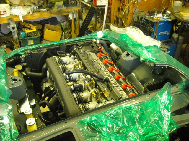 I got ITB linkage synced up and the engine bay finished off, power steering installed, dash and steering wheel in, The muffler is hanging too low for my taste, I'll have to see if I can adjust it some how, Got the rear glass in and the leather all glued in place, more pics of that to come, Got the wheels/tires dressed and snapped in the Mr.K rear view mirror, Now I'm trying to get the engine started but can't get the rpm synced to Megasquirt satisfaction