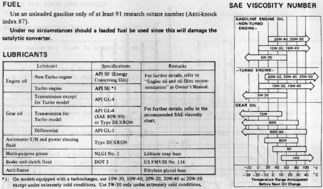 Direct from the 1983 Datsun [by Nissan] 280ZX [Factory] Service Manual: the lubricant tables (cropped from page MA-8). Good luck finding API SE oil though.
