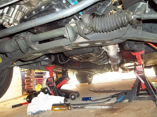 1) jack front up and place on stands (block rear wheels) .. you need room to crawl around under the middle of the Z