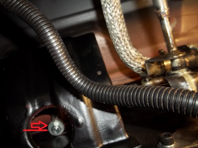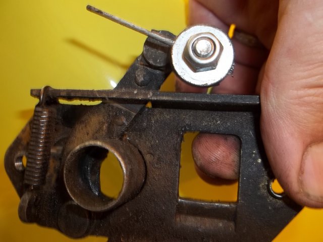 5) here's the release arm end (that shiny nut in the center of the bottom access hole) that you are trying to pry toward the drivers side. note.. mine has already been modified with a bolt inserted.. suspect original one is just the square black metal with a slot to hold the cable end.