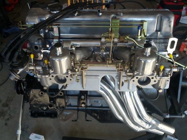 John C I purchased Ztherapy carbs and Steve modified needles based on our discussion of engine size, cam, and compression ratio. I expect that I will not need to mess with the needles. As you know, there are adjustments that I can make and need to be made once we start the engine up. These include float bowl level, linkage (both at idle, 2krpm, and choke) and most importantly, fuel mixture (the screw on the bottom of the carb). It is the setting of the screw at the bottom of the carb that i am referring to (and also balancing float bowl level between the front carb and the rear carb). I think I might be able to spend a couple dollars ($30 for 2) and dynamically measure the fuel mixture with the car under load (driving up hill at constant speed for instance) and compare the front carb setting with the rear carb setting and adjust. What do you think? Attached is a picture of the motor we are building. Jim