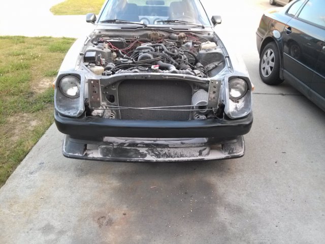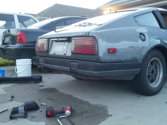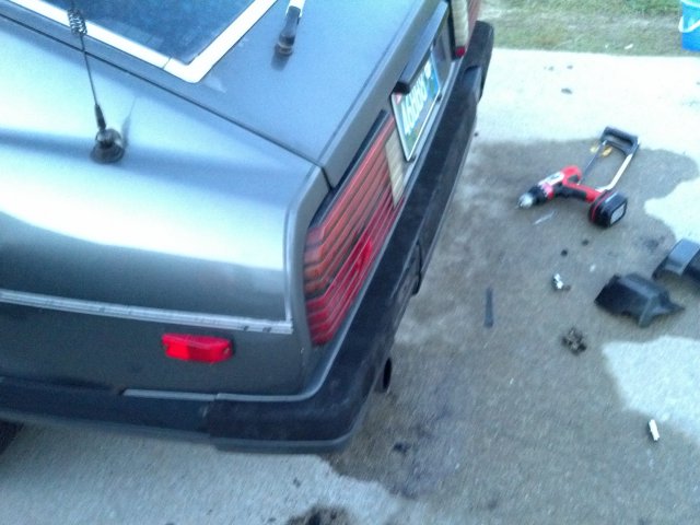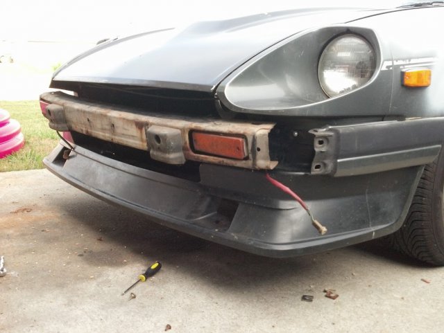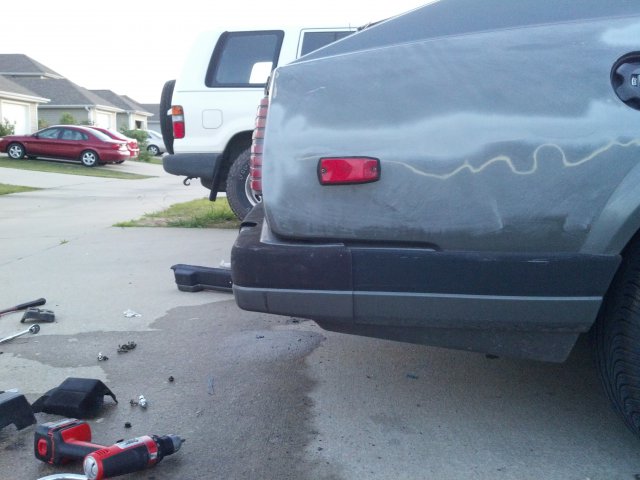 I did a bit more work to my bumper. I took off the cover, then removed the square rubber things, sanded the metal bumper, sprayed it with some black bed liner i had laying around (temporary and not the rubbery kind), and mounted it. Then, i cut the middle out of the cover at the turn signal holes, then screwed the ends back on to cover the huge gap. Re-attached the side trim, took some pictures, and drank a beer.