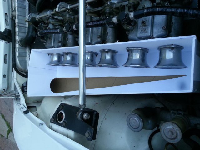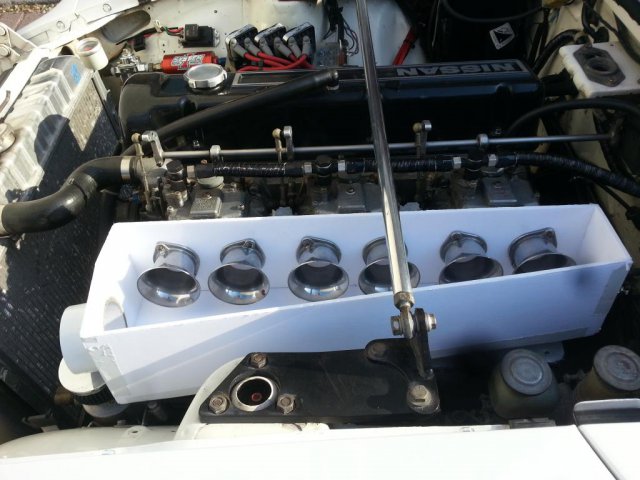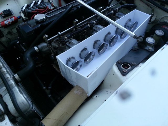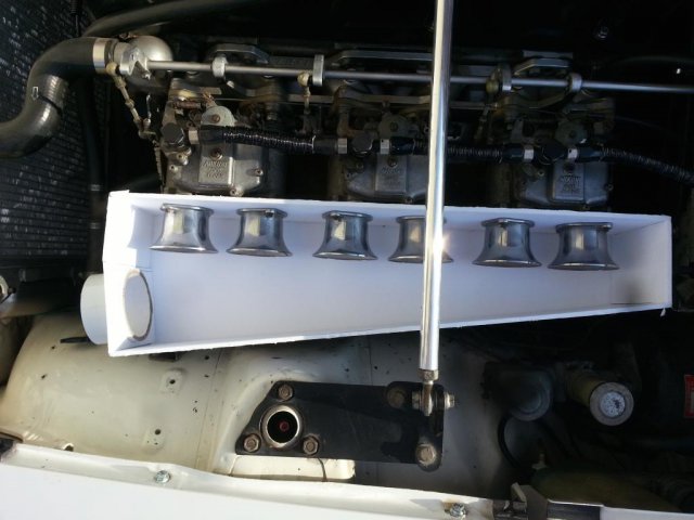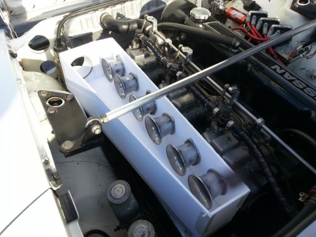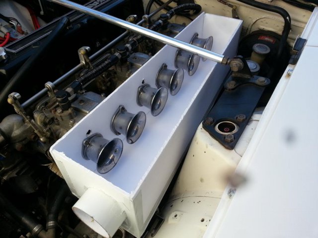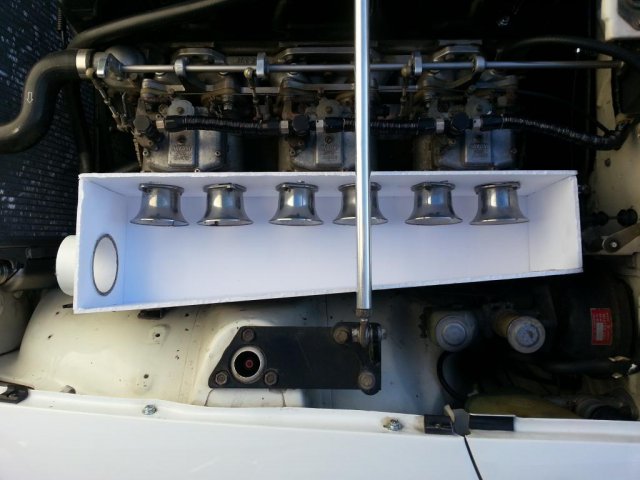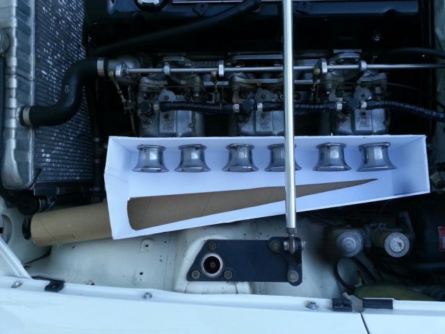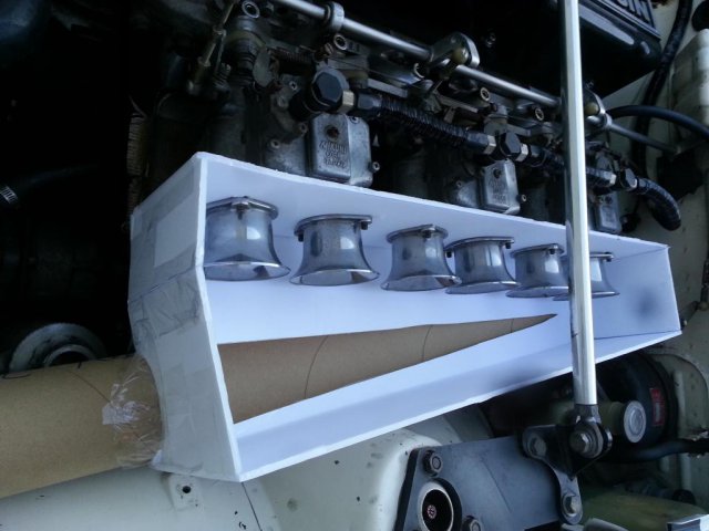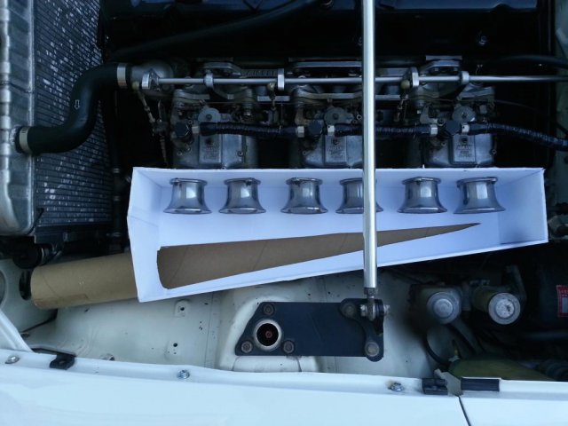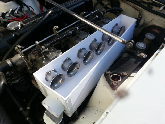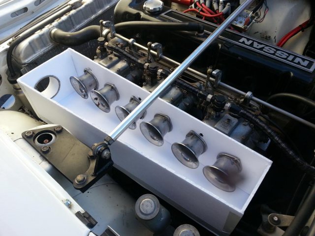 Hey folks, So, after seeing my ITG air filter go up in flames, I've now gone off the idea of running one of those. I bought K&N's and found that my Mikuni air horns were too wide for the filter to squeeze over, and with things being so tight inside those little filters, it wouldn't be ideal. I want to be able to run air horns on my carbs without being limited on size. The ideal solution seems like an air box that feeds cold air from a cone style filter in front of the rad, or at the extreme front left of the car by those 2 round holes in the front clip. I've done a lot of searching, and there are a few of options out there to buy: TWM - http://www.racetep.com/ztripdcoe.html MJP - http://www.mjpshop.co.uk/index.php?route=product/category&path=155_78_113 Reverie (very expensive) - http://www.reverie.ltd.uk/product_detail.php?prod=zolder_macau_6_cyl_airbox_lh_carbon__to_fit_jc100_backplate_range&group=A%20AIRB&subgroup=A%20AIRB%206C&part_code=R01SE0561 My question is: Does the shape of the air box really matter all that much for this application? I have seen others fabricate up aluminum air boxes that are considerably more square. For $30 in sheet aluminum, and some beers to a welder buddy, I could have a basic air box up and running. Do I lose anything by going this route? For example, 10 minutes and some board, and I have mocked up this. Would this with a lid on top, in aluminum, be inferior to the TWM unit? Any thoughts would be very welcome. Thanks.