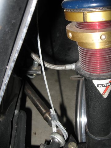My front suspension is droop limited using cables, but only to the point that the front springs are at their free length when the cables are taut. To make mine, I attached a 1/4" clevis yoke to the top of the strut tower inboard and forward of the upper spring seat, and connected this clevis to a sway bar end link using a 1/8" cable and thimbles. I've attached some low quality pictures that show the set-up with the car at ride height (slop in the cable). These cables are not as close as they look to the brake lines. In two years of autocrossing with these cables installed, I have seen no evidence of contact. My rear suspension is droop limited by the strut assemblies (I sectioned them a little more than I should have). I have about two inches of droop travel in the rear from nominal ride height.